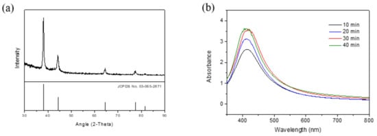 (a) The X-ray diffraction (XRD) spectra of the prepared nanoparticles; and (b) UV-Vis maps obtained for samples prepared using various reaction times.
