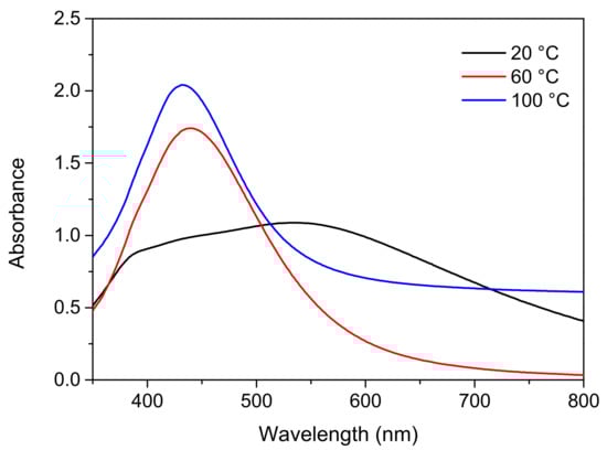 Besides affecting the yield of nanoparticles, the reaction temperature plays a crucial role in determining the nanoparticle size [31,32]. With the AgNO3:Na3C6H5O7:C6H8O6 ratio fixed at 1:6:1, the effect of reaction temperature (20, 60, and 100 °C) on the growth of the nanoparticles was examined. The rotation speed and reaction time were fixed at 300 rpm and 40 min, respectively. Figure 4 illustrates the UV-Vis analysis results. When the reaction temperature was 20 °C, the waveforms showed no characteristic absorption peaks from the Ag nanoparticles. Accordingly, after 40 min of reaction, no Ag nanoparticles were generated. When the reaction temperature was 60 or 100 °C, characteristic absorption peaks were identified at 432 and 438 nm, respectively, indicating the generation of Ag nanoparticles. Moreover, blue shifts were identified at higher reaction temperatures, revealing that the size of the nanoparticles decreased when the temperature was increased. The peak intensity was highest for 100 °C, indicating that the most nanoparticles were generated at this temperature.