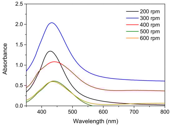 Rotation speed also affects the nanoparticle generation in silver reduction methods [33]. With the AgNO3:Na3C6H5O7:C6H8O6 ratio fixed at 1:6:1 and the reaction temperature and time fixed at 100 °C and 40 min, respectively, the effect of rotation speed on nanoparticle generation was examined. Figure 6 displays UV-Vis maps obtained at various rotation speeds. The peak intensity was considerably higher at a rotation speed of 300 rpm than at 200 rpm, indicating that more nanoparticles were generated. The slight red shift in the peak position also suggested slightly larger nanoparticles. When the rotation speed was 400 rpm, the peak intensity was considerably lower than for 300 rpm, signifying substantially less nanoparticle generation.