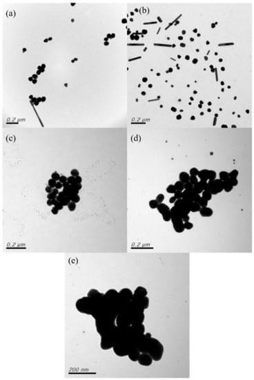 Figure 7 presents the TEM analysis results. As shown in Figure 7a,b, with rotation speeds of 200 and 300 rpm, the nanoparticles exhibited satisfactory dispersibility and no agglomeration was observed. The primary forms of the nanoparticles were nanoballs and nanopillars. As illustrated in Figure 7c, when the rotation speed was increased to 400 rpm, nanoparticle agglomeration occurred and the particles were considerably larger. Underdeveloped nanonuclei also formed. When the rotation speed was 500 rpm, the agglomeration was more severe (Figure 7d). Finally, when the rotation speed was 600 rpm (Figure 7e), clots formed among the Ag nanoparticles. In summary, the TEM analysis results revealed that the nanoparticles prepared at the rotation speeds of 200 and 300 rpm exhibited satisfactory dispersibility and no agglomeration, while the UV-Vis analysis revealed that the number of nanoparticles generated was the highest at 300 rpm. Therefore, 300 rpm was determined to be the optimal rotation speed, and the rotation speed was confirmed to strongly affect nanoparticle generation.