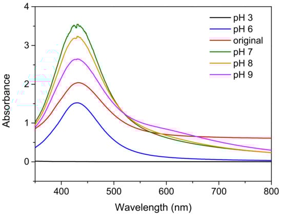 Previous research [6,26] has clearly demonstrated that the electrical and optical performance of AgNPs is influenced by particle size, which is, in turn, influenced by the pH. With the AgNO3:Na3C6H5O7:C6H8O6 ratio fixed at 1:6:1 and the reaction time, reaction temperature, and rotation speed fixed at 40 min, 100 °C, and 300 rpm, respectively, 0.2 M of NaOH and HNO3 was applied to adjust the pH of the Ag nanoparticle solution, and the effect of pH (pH 3, 6, 7, 8, or 9) on nanoparticle generation was investigated. Figure 8 presents UV-Vis maps obtained for samples prepared using various pH values. When the pH was adjusted to 6, the peak intensity was lower than that of the original solution without adding NaOH or HNO3, but the positions of the characteristic peaks were not considerably different. When the pH was adjusted to 3, no substances were detected in the UV-Vis map, and the solution was clear. This indicated that no nanoparticles were generated under strong acidic conditions. When the pH was adjusted to 7, the peak intensity was considerably higher than for a pH of 6. When the pH was adjusted further to 8 or 9, the peak intensity was lower than for a pH of 7, indicating lower nanoparticle generation; however, the characteristic peak positions were unchanged, revealing no difference in particle size.