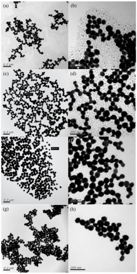 TEM images at two magnifications obtained for samples prepared with pH of: (a,b) 6; (c,d) 7; (e,f) 8; and (g,h) 9.