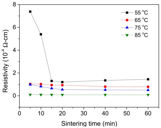 In consideration of the experimental results and practical factory production conditions, the use of energy to raise sintering temperature must be minimized. Therefore, 65 °C and 20 min were determined to be the optimal sintering temperature and time, respectively. The resulting electrical resistivity value was close to the values reported by Cao et al. (2017) [26] (5.01 × 10−3 Ω cm) and Ahn et al. (2011) [28] (1.22 × 10−4 Ω cm). Additionally, the advantages of the conductive ink presented in this work include low-temperature sintering and stable dispersion for a long time.