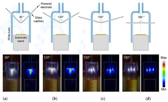 Unlike a pin-type bare electrode structure in which the electric field is locally concentrated at the end of the pin-type electrode due to its protruding shape [23,24,25], it is necessary to first check where the discharge occurs in a plasma reactor with a powered electrode in which the wire is positioned parallel to the substrate. The discharge behaviors were tested by placing a bare wire in the center of the plasma reactor and varying the bending angle of the wire protruding toward the substrate as depicted in Figure 2. A 0.5 mm-diameter tungsten wire was used as the power electrode and covered with a glass capillary, and 20 mm was left exposed in the center of the wire for plasma generation.