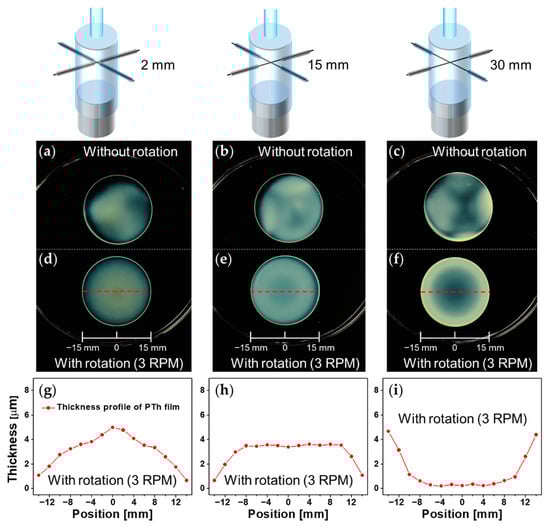 (a–c) Photographs of PTh films deposited onto glass disks with bare-wire lengths of (a) 2 mm, (b) 15 mm, and (c) 30 mm in an AP plasma reactor without substrate rotation; (d–f) Photographs of PTh films deposited onto glass disks with bare-wire lengths of (d) 2 mm, (e) 15 mm and (f) 30 mm with substrate rotating at 3 rpm; (g–i) Thickness profiles of the rotated nanostructured PTh films in (d–f).