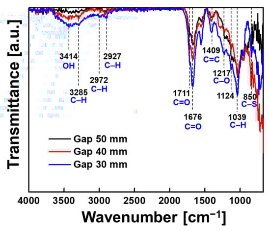 Figure 6 depicts the ATR-FTIR spectra of the PTh films, which show the characteristic peaks of PTh films as follows: C–S bending (850 cm−1), C–H in-plane deformation (1039 cm−1), C–O stretch bending (1217 cm−1), C=C asymmetric stretching vibration mode of the thiophene ring (1411 cm−1), C=O symmetric stretching vibration modes of the thiophenering (1675 cm−1 and 1711 cm−1), and C–H stretching vibrations (2931 cm−1, 2977 cm−1, and 3282 cm−1) [29,30,31]. When D was 30 mm, it was observed that the intensity of most of the main peaks increased in the region of greater than 1039 cm−1 on ATR-FTIR, indicating that the contribution of the main chemical groups constituting PTh was improved. Although the PTh films were successfully deposited onto the substrate under all D conditions, the quality of the PTh films changed as D was varied. Consequently, we tentatively determined the optimal D to be 30 mm based on the results shown in Figure 5 and Figure 6.