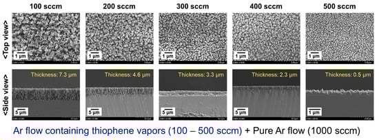 To determine the optimal amount of thiophene monomer under the experimental condition where D is 30 mm, the morphological properties of the deposited PTh film were investigated while changing the Ar flow applied to the bubbler containing liquid thiophene monomer. As the Ar flow for the vaporized thiophene increased from 100 to 500 sccm, the thickness of the nanostructured PTh films gradually decreased while the grain size of the PTh nanoparticles did not significantly change, as shown in Figure 8. When only the amount of vaporized thiophene molecules increased under the experimental conditions that were employed in this study, the Ar discharge became unstable, which adversely affected AP plasma polymerization and the growth rate of the PTh film. If the driving voltage of the plasma is increased, it is expected that the growth rate of the PTh film can be increased even at Ar flows for the thiophene vaporization of 200–300 sccm. However, when the driving voltage increased, the imbalance of the four discharge regions became more severe. Therefore, the Ar gas flow rate for the thiophene vapor injection was optimized to 100 sccm under the current experimental conditions. This is because a nanostructured PTh film with a sufficient thickness of 5 to 10 μm can be obtained with a short process time of 10 min while maintaining a low driving voltage.