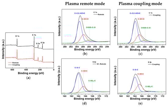 Figure 10b–e show the high-resolution XPS spectra of C 1s and S 2p. In Figure 10b,c, the C 1s peak consisted of three distinctive component peaks attributed to C–C, C=C, C–H bonds (284.9 eV), C–S, C–O bonds (286.2 eV), and C=O, O–C–O bonds (288.1 eV) [29,34]. The presence of C–O, C=O bonds in the high-resolution XPS of C 1s were also confirmed by the FT-IR results. In Figure 10d,e, the S 2p peak could be decomposed into a C–S–C bond (164.0 eV), C–SO–C bond (165.3 eV), and C–SO2–C bond (168.2 eV), which were revealed by the aromatic ring of PTh [34,35]. The ratios of the deconvoluted components of C 1s and S 2p are summarized in Table 4. The presence of sulfur oxides in the PTh nanostructure synthesized at AP indicated that oxygen in the atmosphere was partially excited by plasma energy. Ratios of sulfur oxides (C–SO–C and C–SO2–C) to sulfide (C–S–C) were 0.33 and 0.64 for the plasma remote and coupling modes, respectively, meaning that more excited oxygen was involved in the synthesis process in the plasma coupling mode than in the plasma remote mode. Therefore, it was confirmed that more plasma energy was applied to the substrate with the PTh film in the plasma coupling mode.