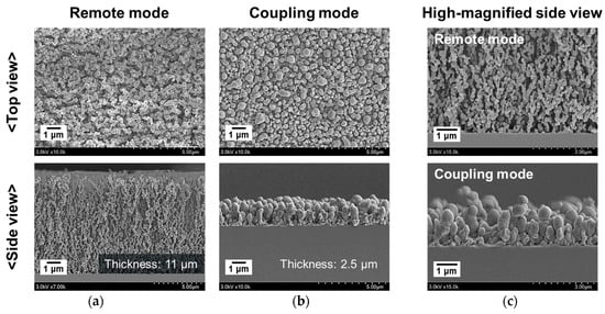 Comparison of FE-SEM images of plasma remote mode and coupling mode: (a) plasma remote mode, (b) plasma coupling mode, and (c) magnified side view FE-SEM images in the two different plasma modes.