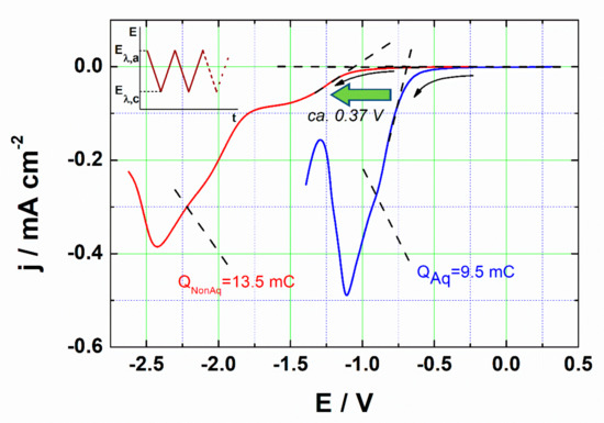 Figure 1 shows the voltammetric response recorded during the first potential scan (toward cathodic potentials, i.e., the forward scan) of the PC electrochemical reduction of a GO-coated silicon electrode in both aqueous (Eλ,a = 0.30 V; Eλ,c = −1.4 V) and non-aqueous media (Eλ,a = 0.25 V, Eλ,c = −2.6 V) at a scan rate of 20 mV s−1.