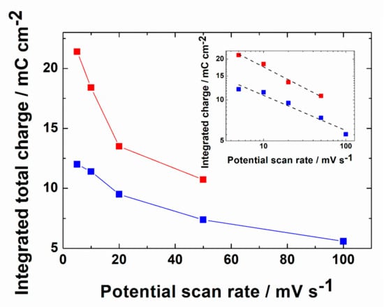 It can be appreciated that in the case of the erGOnon-aq sample (red dots), the involved electric charge was larger than that employed in the production of the erGOaq sample, irrespective of the potential scan rate. This clearly suggests that a larger amount of OFGs was reduced when the reduction was carried out in a non-aqueous medium. As shown in Figure 2, the integrated charge was strongly affected by the potential scan rate. The net charge was proportional to the inverse of the potential scan rate, indicating a sluggish and kinetic-controlled process on the graphene oxide reduction [64,65]. Furthermore, in order to explore the possibility of simple power law dependence, the double logarithmic format was chosen and depicted as inset in Figure 2. It can be appreciated that log Q scales linearly with log ν. The slopes of these plots are −0.18 (r = 0.993) and −0.21 (r = 0.999) for the aqueous and non-aqueous cases, respectively. These values are not as large as the value of −0.5 characteristic of a diffusionally controlled process, whereas they are closer to the value of zero, characteristic of an ideal surface-confined redox couple, as expected for OFGs decorating the 2D graphene oxide network [66,67]. It should be noted that the reaction path of the electrochemical reduction to obtain erGO is not exactly known and few studies have focused so far on the elucidation of the electrochemical reduction mechanism [10,41,63]. Reasonably, the electrochemical reduction of GO is expected to take place in several steps, due to the varied chemical structure of graphene oxide nanosheets [15,40,48]. In fact, as reported in Figure 1, in the aqueous and non-aqueous media, the j–E voltammetric response exhibited a broad band feature, as an indication of the numerous types of oxygen functionalities present, which were reduced at different potentials (merged into one single broad band response).