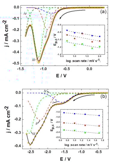 Since the potential values (Ep,c) of the deconvoluted individual peaks appear to shift to more cathodic values as the potential scan rate increases (please see our previously published work [41] and the SM of the present work for studies carried out in aqueous and non-aqueous media, respectively), a further evaluation of the influence of the scan rate on the cathodic peak potential was carried out. The variation of Ep,c with the logarithm of the scan rate, log ν, for the different deconvoluted peaks is shown in the insets of Figure 3 for both aqueous and non-aqueous medium cases. It can be appreciated that the Ep,c scaled linearly with log ν, which allowed us to determine the value of the overall electron transfer coefficient αn (where α is the transfer coefficient and n is the number of electrons transferred for the oxidation/reduction process) through Laviron’s approach. According to Laviron’s description of an irreversible electrochemical process [65,72], Ep,c is related to the potential scan rate ν by: