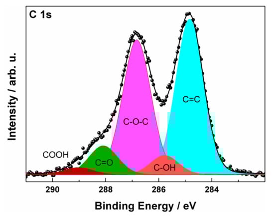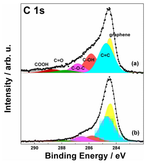 The typical spectral contributions of GO arising in this region are those related to the carbon atoms surrounded by different chemical environments [40,76,77], attributed C=C groups with nearly localized characteristics, C–OH (hydroxyl), C–O–C (epoxyl), C=O (carbonyl, quinonyl) and COOH (carboxyl) OFGs [76,77,78] (see Table 2). According to Figure 4 and Table 2, it is apparent that the dominant OFG in pristine GO was the epoxy group on the basal plane, as expected according to Hummers’ method used by the supplier for its synthesis. Upon electrochemical reduction (Figure 5, Figure S5 and Figure S6) the same C 1s components could be found, but a further peak was needed to allow for a satisfactory convergence of the fitting procedure. This additional feature (i) was narrower than the others, (ii) displayed an asymmetry on the high-BE side, and (iii) was shifted to a low BE with respect to the C=C component in pristine GO. According to these characteristics, this contribution can be assigned to C=C groups within an extended network of conjugated π bonds, such as that resulting from the restoration of the graphene structure after the elimination of oxygenated moieties [40,48,78].