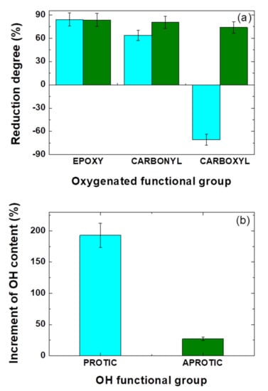 where and are the percentage amounts of the corresponding OFG on the GO surface before and after the electrochemical reduction, respectively. On the basis of the and values extracted from the XPS results presented in Table 2, comparison plots of the reduction degrees for the main OFGs, i.e., epoxy, carbonyl, carboxyl and hydroxyl are presented in Figure 6 and Table S1. These results show two different and opposite behaviors corresponding to the various OFGs. In fact, as anticipated above, the epoxy and carbonyl OFGs were both abated, whereas the hydroxyl content increased in both the aqueous and non-aqueous media (Figure 6). On the other hand, the carboxyl OFG content increased in the aqueous medium and decreased in the non-aqueous one (Figure 6). More specifically, the reduction degree of the epoxy OFG was similar in both electrolytic media, whereas use of the non-aqueous medium was more efficient for the reduction of the carbonyl OFG.