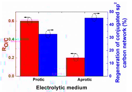 Figure 7 also shows that the graphitic carbon sp2 domains were restored to a larger extent in the non-aqueous electrolyte when compared to that in the aqueous one. The efficient reduction of pristine GO nano-sheets in the aprotic electrolyte is therefore evidenced by the coupling of a good RO/C value with a good restoration of sp2 network.