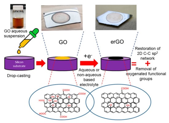 The electrochemical reduction of the GO layers was carried out through a two-step route, involving: (i) drop-casting the GO sheets onto a silicon electrode surface; then (ii) electrochemical reduction using a standard three-electrode electrochemical system in the presence of an aqueous or non-aqueous electrolyte. Scheme 1 depicts this procedure in the production of electrochemically reduced GO (erGO) layers on a silicon surface.
