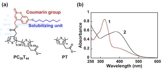 Figure 1a shows the chemical structures of the polythiophene derivatives PC56T44 and PT. PC56T44 includes a (coumarin-4-yl)methyl moiety as a photocleavable group and an octyloxy side chain as a solubilizing unit. PT possesses a methyl acetate group without a photoreactive group. The absorption spectra of PC56T44 and PT in THF are shown in Figure 1b. The maximum absorption wavelength (λmax) values for PC56T44 are 322 and 381 nm. The former λmax is due to the S1 → S0 transition of the coumarin group [], while the latter is due to the π–π* transition of a polythiophene unit in a random coil structure []. Since PT also has the π–π* transition at 383 nm, PC56T44 and PT show similar π-conjugated structures in the polythiophene chain.