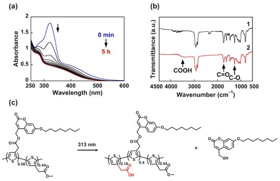 (a) Changes in the absorption spectra of PC56T44 upon irradiation at 313 nm in THF. (b) FT-IR spectra of PC56T44 (1) before and (2) after irradiation at 313 nm for 5 h. (c) Schematic showing the photocleavage of PC56T44.