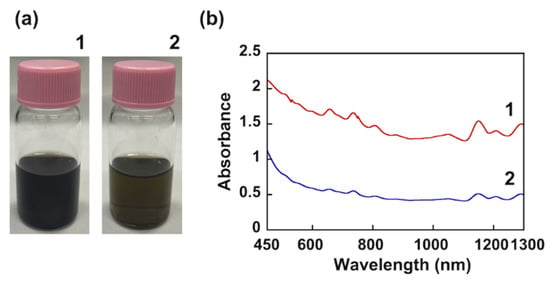 (a) Photographs of suspensions in THF. (b) Absorption spectra of suspensions in THF. (1) PC56T44/SWCNT composite (1:1 (w/w)), (2) PT/SWCNT composite (1:1 (w/w)).