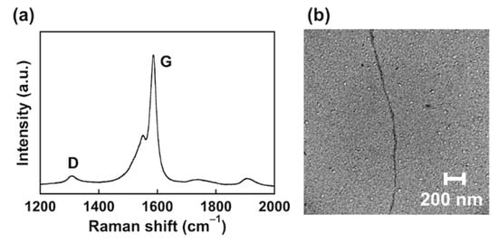 The SWCNT dispersion was investigated using TEM (JEM-1230, accelerating voltage: 80 kV, JEOL Ltd., Tokyo, Japan), scanning electron microscopy (SEM; Quattro ESEM, accelerating voltage: 5 kV, Thermo Fisher Scientific, Waltham, MA, USA), and Raman spectrometry (LabRAM, excitation wavelength: 633 nm, HORIBA Jobin Yvon, Kyoto, Japan).