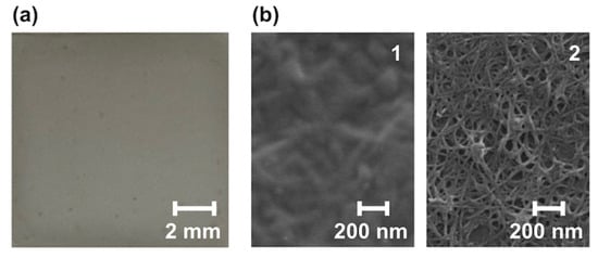 (a) Photograph of a PC56T44/SWCNT composite film formed on a substrate. (b) SEM images of the PC56T44/SWCNT composite film (1) before and (2) after irradiation at 313 nm.