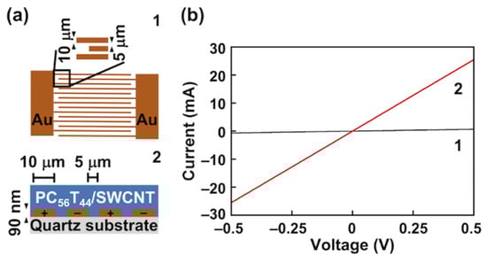 (a) Schematics showing the (1) top view of the interdigitated gold electrodes and (2) the side view of the sample configuration. (b) Current–voltage characteristics of the PC56T44/SWCNT composite film (1) before and (2) after photocleavage at 313 nm.