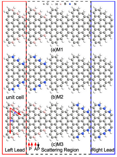We consider a two terminal source–channel–drain nanodevice as shown in Figure 1. The STGNRs device is divided into three regions: left electrode (bounded by red frame in Figure 1), right electrode (bounded by blue frame in Figure 1) and the scattering region (bound by dashed black frame in Figure 1). The integer denotes the number of hexagonal rings along the width and the length of a nanoribbon in a unit cell, respectively. The edge atoms are saturated by 1H atoms as 1H termination (sp hybridization) is commonly employed in both pristine and doped GNRs [35]. We investigated STGNR nanodevices with three different electrode combinations as shown in Figure 1: (i) device M1 with B-doped left electrode and pristine STGNR right electrode, (ii) device M2 with N-doped left electrode and pristine STGNR right electrode and (iii) device M3 with B-doped left electrode and N-doped STGNR right electrodes. The scattering region contains three unit cells. The left cell belongs to the left electrode, and the right cell belongs to the right electrode. We have checked the spin-dependent transmission spectra of the devices with different scattering region lengths and found that they are almost identical, thus suggesting that the chosen structures are sufficient in screening the interaction between the electrodes and the center scattering channel region. Since STGNR (5, 3) is a bipolar magnetic semiconductor [21] and edge doping can manipulate its spin transport properties, the pristine and edge-doped STGNR (5, 3) are adopted as the electrodes of the device. The left electrode can be switched between the P and AP magnetization configurations with respect to the right electrode. The scattering region includes a unit cell of pristine STGNR (5, 3). The electrodes used in our model are ideal contacts as a part of the central region, and the contact regions have an identical crystal and electronic band structure. It should be noted that when contacted by an external metal, the electronic properties of the contact heterostructure could be significantly modified due to the coupling and interaction between the metal contact and the GNR [9,36,37]. High-quality electrical contacts with weak van der Waals coupling [38,39,40] with the GNR are thus required to preserve the spintronic transport properties predicted in this work.