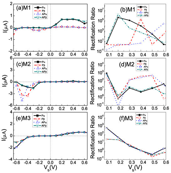 Secondly, all devices exhibit significant spin-rectifying effect. The nonlinear and unidirectional spin-polarized current for the P/AP electron of device M1 can be observed in Figure 2a under positive bias but suppressed under the negative bias, while for the P/AP, the opposite behaviors are observed. To evaluate the rectifying effect, the spin-resolved RR of device M1 is presented in Figure 2b, i.e., [35]. It can be seen that giant RR can be achieved in device M1 and the maximum value of RR reaches 4.5 × and 1.9 ×, 3.0 × and 9.3 × for the P and AP, P and AP channels, respectively. The M1 device structure is thus a high-performance spin diode. For device M2 (Figure 2c), a current peak appears under the negative bias voltages of −0.6 ∼−0.2 V for all spin-resolved transport channels. The current is, however, suppressed under positive bias. The maximum RR of device M2 reaches above 10 (see Figure 2d). This suggests that the device M2 exhibits inverse rectification and could be operated as a molecular spin diode and random access memory cells. As shown in Figure 2e, the device M3 shows semiconducting behavior with a threshold voltage window around −0.3 ∼ 0.1 V. The device M3 exhibits a rectification effect with a maximum ratio around 10 for electrons, as shown in Figure 2f.