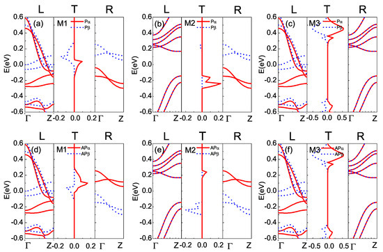 To explain the above I-V characteristics, the spin-dependent transmission (T) spectra and the spin-resolved band structure for the left (L) and right (R) electrode are calculated in Figure 3. Here, Figure 3a–c correspond to the P configuration, and Figure 3d–f correspond to the AP configuration for M1–M3, respectively. The red and blue lines denote the spin-up (-spin) and spin-down (-spin) states. The computed Fermi energy E are −5.85 eV, −1.73 eV and −5.85 eV for M1–M3, respectively, which are set to zero. Pristine STGNR (5, 3) is a bipolar magnetic semiconductor at the ground state [21,25]. In the P configuration for M1 and M2 Figure 3a,b, there are no subbands crossing the Fermi level (E) for the pristine STGNR (5, 3) right electrode, and the the valance (-spin) and conduction (-spin) subbands are energetically split, which is in good agreement with the previous theoretical research [21]. Moreover, it can be seen from the left panels of Figure 2a that - and -spin subbands are separated and both cross the E, thus revealing the metallic and spin-polarized electronic properties of the B-doped STGNR left electrode. The matching and the overlapping of valance (-spin) and conduction (-spin) bands in the B-doped left electrode and the pristine right electrodes contribute to two spin-polarized transmission peaks P and P near the E. However, from the left panels of Figure 3b, it can be seen that the N-doped STGNR left electrode in device M2 exhibits a semiconductor behavior with a band gap 0.31 eV. The energy bands of the N-doped left electrode and that of the pristine STGNR right electrodes are aligned with each other below and above the E, which lead to a P transmission peak situated below the E and a P transmission peak situated above the E. In contrast, for the AP configurations Figure 2d,e, which can be achieved by an external perpendicular magnetic field that switches the spin ordering of the right electrode, the valance and conduction subband of the pristine STGNR right electrode is transformed into -spin and -spin, respectively. Therefore, the -spin and -spin transmission peaks in the AP configuration are interchanged as compared to that of the P configurations.