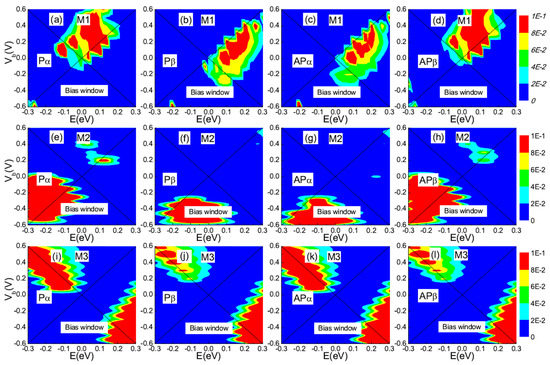 According to the Landauer–Büttiker formula, the spin-dependent current is determined by the transmission within the bias window (BW). To further explain the I-V characteristics, we present the 3D plot of the spin-resolved transmission spectra as a function of both electron energy (E) and bias (V) for devices M1-M3 in Figure 6. The region highlighted with the (black) cross line represents the BW. By comparing Figure 6a,c with Figure 6b,d, it is can be seen that there is significant P and AP transmission for device M1 under the bias regime V 0 V, while the step edge of the P and AP transmission shifts to the higher-energy regime and remains nearly outside of the bias window. Thus, the P and AP transport channels are in the ON state when V 0 V while the P and AP transport channels are in the OFF state. On the contrary, the P and AP transmission spectra are driven to a lower energy and move into the transport window within the bias range of (−0.4, 0 V), while the P and AP transmissions are almost zero within this bias. As a result, the P and AP transport channel is OFF while the P and AP transport channel is ON. This leads to a significant difference in the tunneling current between the two spin states, as shown in Figure 2a, and directly leads to the near-perfect dual spin filtering effect as well as the strong spin rectification effect. Moreover, the asymmetry of the I-V characteristic of devices M2 and M3 can also be understood by analyzing the spin-resolved transmission spectra as a function of bias. As shown in Figure 6e–h, the spin-up and spin-down transmission spectrum fill the negative bias (−0.6, −0.2 V), which contributes to the spin-resolved currents under negative bias voltages and thus the inverse rectification effect. For M3, as shown in Figure 6i–l, the spin-dependent transmission peaks occur within the negative bias (−0.6, −0.3 V) and the positive bias (0.2, 0.6 V), while they are far away from BW within the bias (−0.2, −0.1 V). Thus, it leads to a significant asymmetric current as shown in Figure 2e.