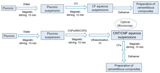 The schematic diagram, showing the preparation of various aqueous suspensions, is shown in Figure 2. The aqueous suspensions of CF, using 5 wt.% of Pluronic F-127 (on the weight of water), were prepared by first mixing Pluronic F-127 in water with the help of magnetic stirring for 10 min. CFs were then added in the surfactant solution and mixed with the help of magnetic stirring for another 10 min. In case of aqueous suspensions containing CFs, along with MWCNTs or CNFs, MWCNT or CNF powder was first added to the surfactant solution and then magnetic stirring was carried out for 10 min to ensure that there were no big lumps of MWCNTs/CNFs in the aqueous suspensions. The MWCNT/CNF surfactant suspensions were then kept in a bath ultrasonicator (Sonica Ultrasonicator 3200 S3, Milan, Italy) operated at 40 kHz frequency and 180 W power for 1 h. After removing the MWCNT/CNF suspensions from the ultrasonicator, CFs were added and mixed using magnetic stirring for 10 min. The defoamer (in the weight ratio of 1:0.5 with respect to Pluronic F-127) was then added to the suspensions, which were used later for the fabrication of cementitious composites. For the characterization of CNT/CNF dispersion in aqueous suspensions, the defoamer and CFs were not added to avoid film formation by the defoamer and agglomeration caused by CFs during the characterization of aqueous suspensions. Figure 2 shows the magnetic stirring and ultrasonication processes of aqueous suspensions and Figure 3c shows a suspension containing MWCNTs and CFs.