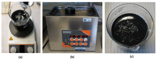 Preparation of aqueous suspensions: (a) magnetic stirring, (b) ultrasonication and (c) the aqueous suspension containing CFs and MWCNTs.