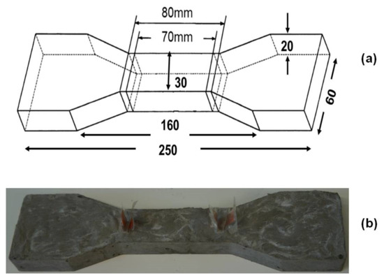 Cementitious composites were fabricated using aqueous suspensions of CF or CF with MWCNTs/CNFs (315 mL) and cement (900 g) following EN 196-1:2006 standard. A set of unreinforced samples, i.e., plain mortars, were also prepared using water (315 mL) to compare with the reinforced cementitious composites. The weighed amount of cement was mixed with the aqueous suspensions using a Hobart mixer; the mixer was set for 1.5 min at a slow speed (140 ± 5 rpm) and then 1.5 min at a high speed (285 ± 10 rpm). The mixtures were then poured into the molds (three samples were prepared for each mixture). The specimens were prepared in a dog-bone shaped mold (having a cross section of 30 mm × 20 mm, the distance between the inner grid for voltage measurement was 70 mm and the outer grid for passing current was 80 mm), as shown in Figure 4, in order to perform the piezoresistive measurement. The grids were made of copper foils having 30 mm × 15 mm dimension.