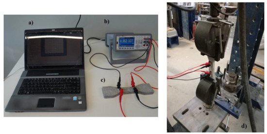 The test setups for the characterization of the electrical resistance and stress sensing properties of cementitious composites are shown in Figure 5. Stress sensing properties were characterized by measuring the electrical resistivity of samples using a digital multimeter (Agilent 34460a, Santa Clara, CA, USA) in the elastic regime of tensile loading with three different loading rates: 20, 30 and 40 N.s−1. For each loading rate, the load was increased from 0 N up to 10 s and then decreased to 0 N at the same unloading rate. 5 cycles of loading and unloading (20 s per cycle) were studied at each loading rate to verify the repeatable performance of the developed cementitious composites. The DC electrical resistance was measured simultaneously during the mechanical testing using a four-probe method. Fractional change in the resistivity (FCR) and stress sensitivity of the composites in each cycle were calculated using the following equations:
