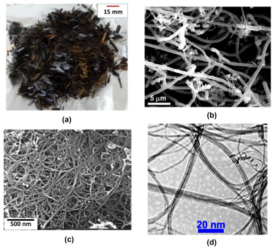 Reinforcement of cementitious composites: (a) short CFs, (b) SEM micrograph of CNFs and (c) SEM micrograph MWCNTs and (d) TEM image of MWCNTs, taken from manufacturer website.