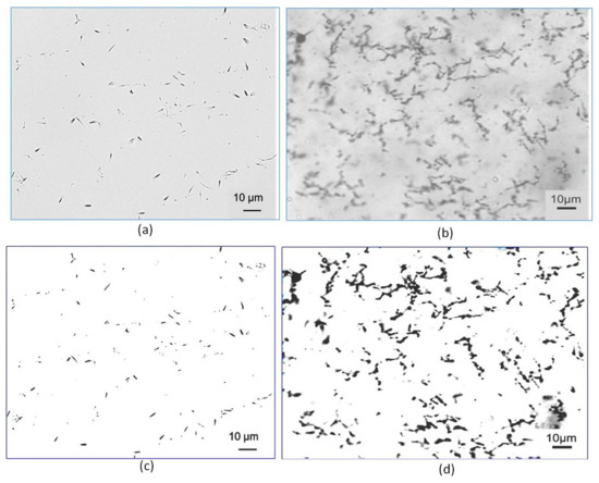 The optical micrographs of aqueous suspensions of MWCNT and CNF are shown in Figure 7. It is clear from Figure 7a that MWCNTs could be homogeneously dispersed in water using a Pluronic F-127-assisted ultrasonication process. MWCNTs were dispersed without any noticeable agglomeration. Homogeneous dispersion of CNTs and CNFs is prerequisite for developing high performance cementitious composites [9] and the use of Pluronic F-127 was proven to be effective in achieving homogenous CNT dispersion in previous studies also [10,11]. It can also be clearly observed from Figure 7c that dispersed MWCNTs formed electrically conductive pathways within the aqueous medium. The aqueous suspension of CNF also showed homogeneous dispersion free from noticeable CNF agglomerates. To the best of authors’ knowledge, Pluronic F-127 has been utilized to disperse CNFs for the first time in the present study and a homogeneous dispersion was obtained due to the steric stabilization induced by Pluronic F-127 molecules, as previously reported for CNTs [10,11]. However, in this case, a few CNFs were seen to form bundles with each other and formed a greater number of noticeable electrically conductive pathways when compared to MWCNTs within the aqueous medium, as can be seen from Figure 7d.