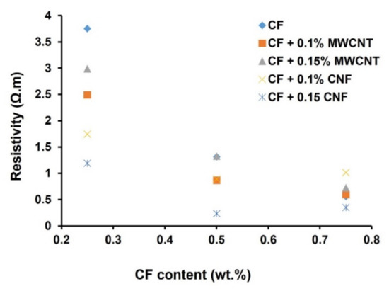 - The electrical resistivity of CF-based composites decreased with the increase in CF content from 0.25 to 0.75%. The incorporation of CNF and MWCNT (0.1 and 0.15% of cement weight) in CF-based composites led to a significant decrease in the electrical resistivity of cementitious composites.