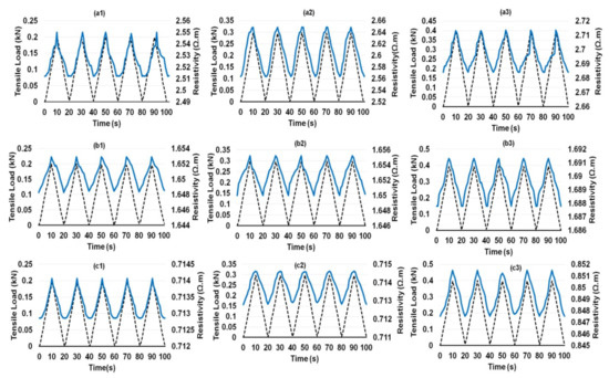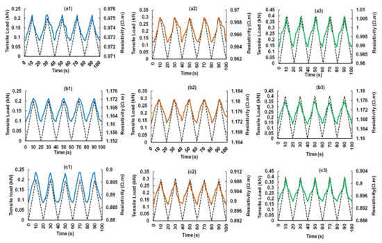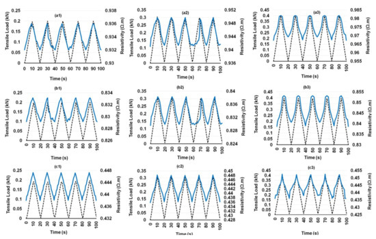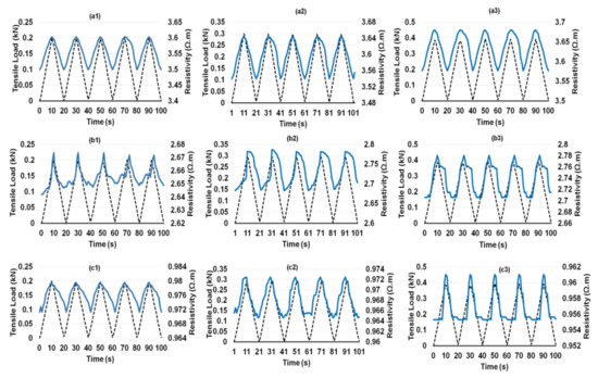 Change of electrical resistance with cyclic tensile load of CF reinforced cementitious composites at different peak loads containing 0.25% CF (a1–a3), 0.50% CF (b1–b3) and 0.75% CF (c1–c3).