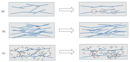 It is clear from Table 5 that the cementitious composites with hybrid fillers, i.e., CFs along with CNFs/CNTs showed lower FCR values when compared to only CF-based composites. The reason for this is the same as discussed above for 0.5 and 0.75% CF-based cementitious composites. The presence of CNF and MWCNTs significantly increased the number of conductive pathways and more touching between the conductive fillers, making the conductive network more stable and less sensitive to the mechanical deformations. Figure 14 explains this phenomenon schematically. It can be observed that when the CF content is low (Figure 14a), the conductive network becomes extended under tensile deformation, increasing the distance between CFs (indicated by dotted circles) and leading to a significant increase in the electrical resistivity. However, at higher CF contents, e.g., 0.75% (Figure 14b), due to higher number of electrical contacts the extension of the conductive network does not significantly change the electrical contact points and, therefore, the change in electrical resistivity is limited. Similarly, the presence of MWCNTs/CNFs in the case of 0.25% CF (Figure 14c) can maintain the electrical contacts between CFs when the conductive network extends under tensile deformation (as can be seen in the dotted circles in Figure 14c). Therefore, the presence of MWCNTs/CNFs results in a significantly lower change in the electrical resistivity under tensile loading. Observations made by Kim et al. support this hypothesis as it was noticed that the hybrid fillers composed of CFs and CNTs made the electrically resistivity less sensitive to the change in water to cement ratio, temperature and evaporation of electrolytic pore solution, due to the extended conductive pathways [14]. However, the authors did not evaluate the effect of hybrid fillers on the piezoresistive properties of the composites.