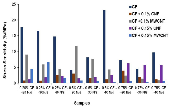 In the cases of hybrid composites with 0.25 and 0.5% CF, the use of MWCNTs led to superior stress sensitivity when compared to CNFs. On the contrary, the stress sensitivity was higher with CNFs when compared to MWCNTs when a higher amount of CF, i.e., 0.75 wt.% CF was used in the composites. The superior sensitivity of MWCNT-based composites at lower CF contents could be attributed to the superior ability of MWCNTs to form a piezoresistive network due to their higher electrical conductivity and smaller dimensions. At higher CF contents, a saturation in the electrically conducting pathways resulted in a lower sensitivity of these composites. Also, the stress sensitivity was superior with 0.1% MWCNTs when compared to 0.15% and this could be due to the increased agglomeration of MWCNTs at 0.15% when dispersed using the same process. On the contrary, composites with 0.15% CNF showed superior stress sensitivity when compared to those with 0.1% CNF. This could be attributed to the fact that CNFs could be more homogeneously dispersed at higher concentrations when compared to MWCNTs using the same dispersion process, due to their lower surface area and agglomeration tendency [29].