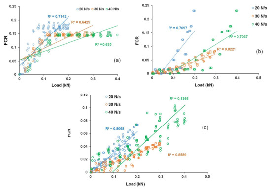FCR-load correlation of cementitious composites containing different carbon fiber contents: (a) 0.25 wt.%, (b) 0.5 wt.% and (c) 0.75 wt.%.