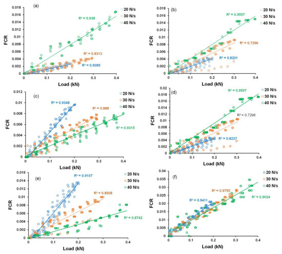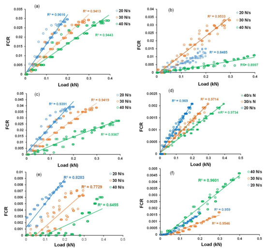 FCR-load correlation of CNF-based hybrid cementitious composites: (a) 0.25% CF + 0.1% CNF, (b) 0.25% CF + 0.15% CNF, (c) 0.5% CF + 0.1% CNF, (d) 0.5% CF + 0.15% CNF, (e) 0.75% CF + 0.1% CNF and (f) 0.75% CF + 0.15% CNF.