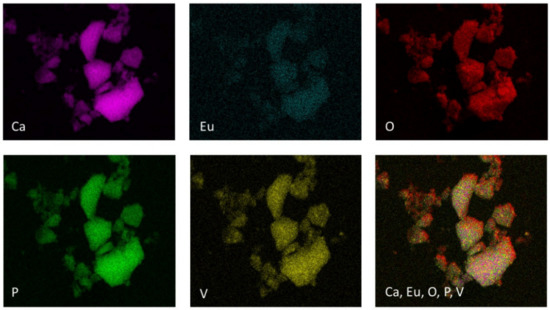 - Pogosova, M.A.; Azarmi, F.; Eliseev, A.A.; Kazin, P.E. Eu and Cu co-substituted calcium vanadate—The crystal structure, luminescence and color. Dyes Pigment. 2018, 148, 219–223. [Google Scholar] [CrossRef]