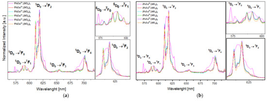 - Binnemans, K. Interpretation of europium(III) spectra. Coord. Chem. Rev. 2015, 295, 1–45. [Google Scholar] [CrossRef]