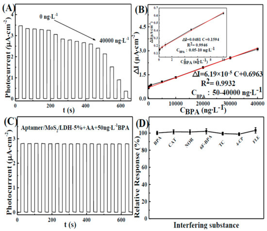 In a 0.1 M phosphate buffer solution (pH = 7.0) containing ascorbic acid (AA, 0.1 M), the stable current of the aptamer/MoS2/LDH-5% electrode under dark conditions was measured. After 20 s, the visible light is turned on; the visible light is turned off after the photocurrent is increased and stabilized, the corresponding concentration of BPA is added after the dark current is stable and then the visible light is turned on to test the photocurrent at this concentration. After adding BPA, the photocurrent was decreased, as seen in Figure 7A. The linear equations were as follows: △I = 0.159 + 0.048c (R2 = 0.9946), with a linear range of 0.05–10 ng L−1; and △I = 0.696 + 6.19 × 10−5c (R2 = 0.9932), ranging from 50 to 40,000 ng L−1 (△I = I0 − I, where I0 is the photocurrent before BPA was added, and I is the photocurrent after BPA was added). Furthermore, the sensor showed a low detection limit of 0.0052 ng L−1 (S/N = 3). At low BPA levels, the local concentration at the electrode surface was rapidly depleted, as the substrate was converted into a product by the catalysis, resulting in the high sensitivity of the electrode response. At higher BPA concentrations, the nano-material is supplied with substrate for a longer period of time and the reaction proceeds over a larger time window. This, together with the possibility of fouling the electrode surface by the reaction products, results in a lower slope. It also attains the saturation level at a higher concentration. Thus, the sensor showed different linear correlations at different concentration ranges [42], as shown in Table S1. The comparison shows that the detection limit of the aptamer/MoS2/LDH-5% photoelectrode was 0.0052 ng L−1 in Table S1. The detection line of the aptamer/MoS2/LDH-5% photoelectrode was lower in area PEC. As a result, the aptasensor featured a large linear range and a low detection limit.