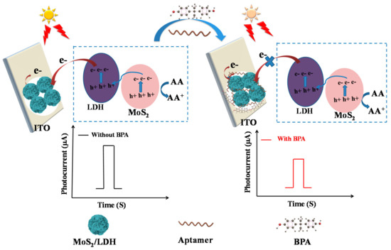 Moreover, after BPA-aptamer modification, the photocurrent of aptamer/MoS2/LDH-5% decreased to 96% of the MoS2/LDH-5% because of the steric hindrance produced by the immobilized aptamer, as well as the electrostatic repulsion between the electronegative AA molecule and the negatively charged phosphate skeleton of the aptamer. Consequently, BPA solution could specifically bind to the aptamer. Since the increased steric hindrance hampered the coupling of AA and photogenerated holes and also encouraged photogenerated hole/electron interactions, the photocurrent was decreased. The above-mentioned moleculars displayed steric resistance at the electrode junction, which inhibited electron transport to the electrode surface and thereby lowered the photocurrent (Figure 5B). The electrostatic repulsion of these substances at the electrode interface prevented electron transport and enhanced electron–hole pair recombination, which lowered the photocurrent. More BPA encouraged the development of aptamer–BPA complexes, which reduced the photocurrent. The BPA concentration can be measured by monitoring the decrease of photocurrent density (Scheme 1) [37,41]. The above characteristics indicate that the MoS2/LDH-5% PEC aptasensor can be used to detect BPA.