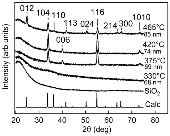 Figure 1 shows that the crystallinity increased with the increase of the growth temperature Tg. The sample deposited at 330 °C was X-ray amorphous, but the samples deposited at higher temperatures showed reflections that were identified as belonging to α-Cr2O3 (mineral eskolaite, ICDD PDF-2 file number 01-078-5435).