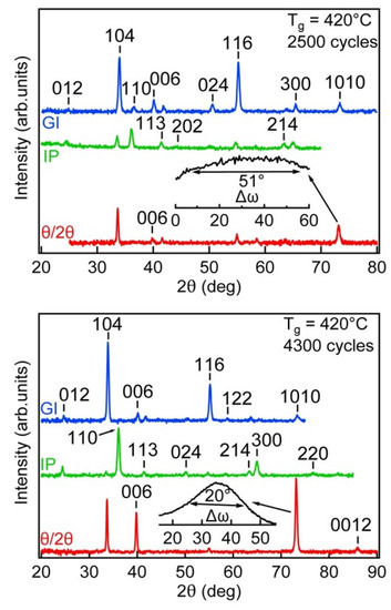 The IP and θ/2θ-XRD patterns from the film deposited with 4300 cycles showed (Figure 3) that, beside the (104) plane, the (001) plane appeared as a preferred growth plane. A relatively high intensity of the 006 reflection, the appearance of the 0012 reflection on the θ/2θ-XRD pattern, the two times smaller FWHM of the rocking curve of the 1010 reflection and the approximately 2.5–3 times larger values of the lattice strain (compared to the film deposited with 2500 cycles), but also strong 110 and 300 reflections on the IP-XRD patterns of this film, allowed us to conclude that, in thicker films (above 230 nm), the mosaicity decrease is accompanied by a preferred growth in the (001) plane.