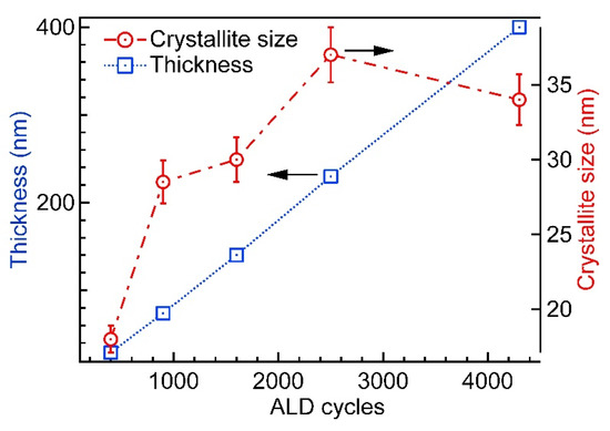 It can be seen that the apparent crystallite size (Dv) depended remarkably on the number of growth cycles or, in other words, on film thickness. The crystallites grew fast during the first 900 cycles of deposition, reaching the size of about 30 nm. The further increase of crystallites proceeded considerably slower—within the next 1300 cycles the increase was only about 7 nm.