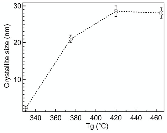 The relation of the deposition temperature Tg and the averaged reduced moduli of the films with thicknesses of 68–85 nm is shown in Figure 6. It can be seen that there was some dependence of moduli on Tg, but the difference was low—about 10 GPa (~10%) in between X-ray amorphous and crystalline thin films at the displacement of 20 nm. A likely reason for such low differences was the influence of a softer SiO2 substrate. Considering that the thin films had thicknesses of only about 68–85 nm, at the displacements of 20 nm, the substrate reduced the measured values and the differences thereof.